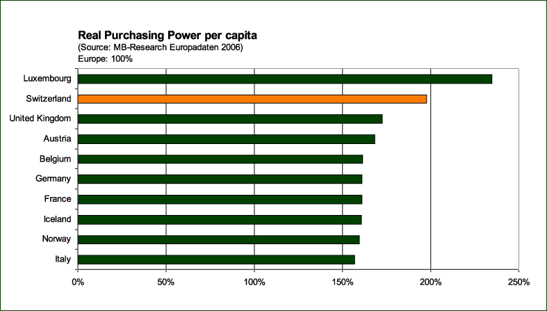 Switzerland has the second highest purchasing power per capita in Europe (income, less taxes and social security contributions). Even after deducting living expenses, Switzerland remains in second place (real purchasing power per capita). This means that in Switzerland, there is more money left over for family, free-time, travel, and pension savings (according to MB-Research Europadaten 2006).